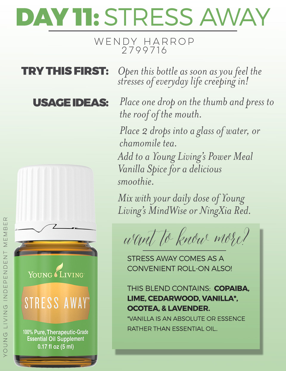 Stress Away is an oil I absolutely LOVE! It was my first oil blend that I tried, chosen because of the name - it said it would do exactly what I needed an oil to do, I loved the smell from the very beginning and I have to say, I have not been disappointed with the results, either. I wear this like perfume on work days, finding that I can approach busy schedules and difficult situations with a more calm and rational head. When I feel the familiar indications of anxiety creeping up, Stress Away on my neck and wrists immediately help settle my nerves. I also love diffusing this oil for a calm atmosphere. I have heard of people using this to help them fall asleep. This one doesn't tend to make me tired, just calm.